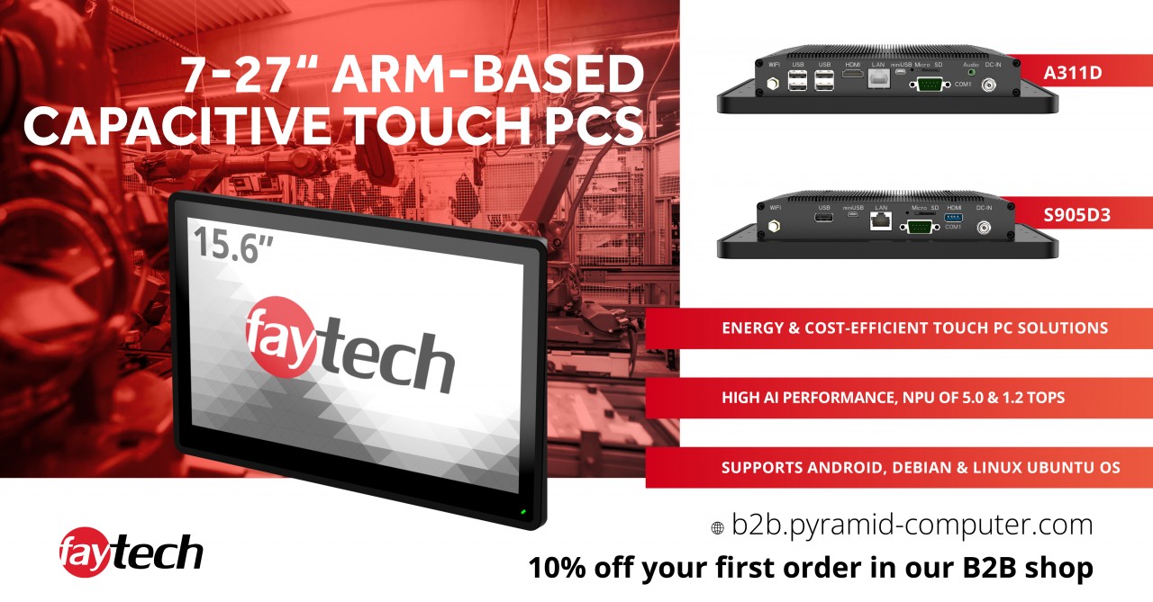 faytech’s ARM-based Capacitive Touch PCs are fanless, energy-efficient systems and designed for customers who need hardware solutions with low power consumption and minimal heat generation. The touch PCs come with Android 9 OS, with the option for Linux distributions like Debian and Ubuntu.